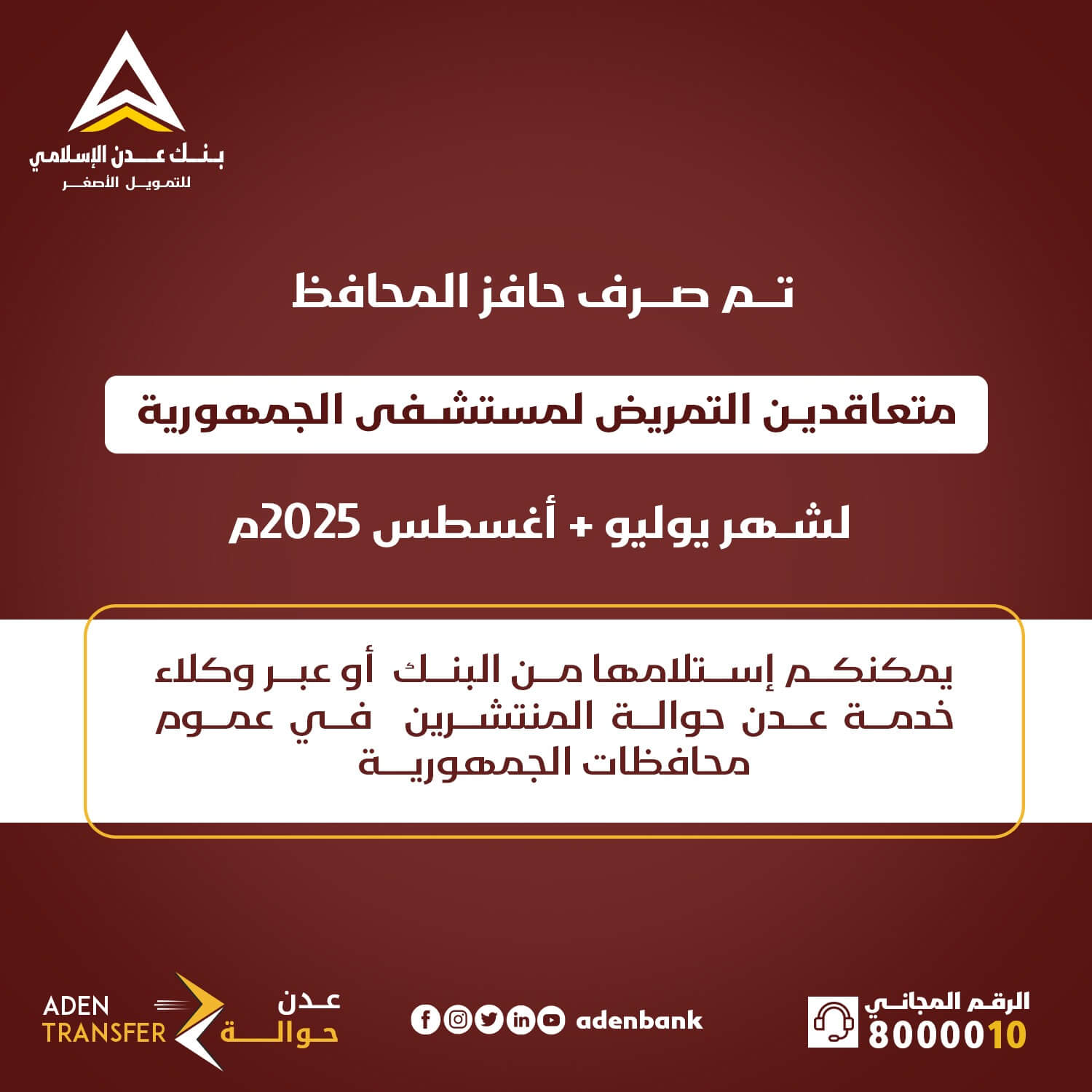 بنك عدن يعلن بدء صرف حافز المحافظ لمتعاقدين التمريض في مستشفى الجمهورية لشهري يوليو وأغسطس