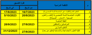 مع مراعاة تواريخ بدء عملية التسجيل في الكليات كما هو موضح في جدول المواعيد اعلاه.