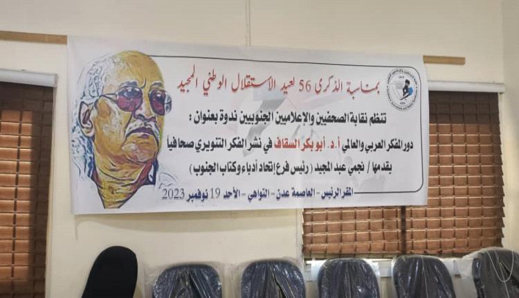 تُقيم نقابة الصحفيين والإعلاميين الجنوبيين، ندوة بعنوان: (دور المفكر العربي والعالمي أ. د. أبو بكر السقاف في نشر الفكر التنويري صحافيًا)، بمناسبة الذكرى الـ(56) لعيد الاستقلال الوطني المجيد، الـ(30) من نوفمبر، وذلك صباح يوم الأحد 19 نوفمبر 2023م، في المقر الرئيس للنقابة بمديرية التواهي في العاصمة عدن.