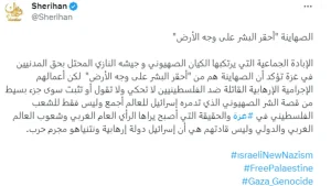 وكتبت شريهان في منشور لها شاركته عبر حسابها في “أكس”: “الإبادة الجماعية التي يرتكبها الكيان الصهيوني وجيشه النازي المحتل بحق المدنيين في غزة تؤكد أن الصهاينة هم من “أحقر البشر على وجه الأرض”.
