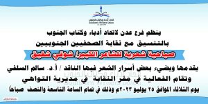 ودعا اتحاد أدباء وكتاب الجنوب فرع العاصمة الجنوبية عدن كافة المثقفين والأدباء الجنوبيين، والمهتمين بالشعر إلى حضور الصباحية الشعرية، وإثراها، والتفاعل معها.