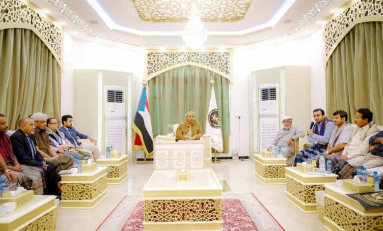 وعبّر الرئيس الزُبيدي في مستهل اللقاء، الذى حضره عضوا هيئة الرئاسة محمد الغيثي، والعميد علي الجبواني، والدكتور ناصر الخبجي رئيس الهيئة السياسية المساعدة، وسالم ثابت العولقي رئيس الهيئة الوطنية للإعلام الجنوبي، عن تقديره للحرص البالغ الذي أبداه ممثلو شبوة في الجمعية الوطنية والمجلس الاستشاري لإنجاح انعقاد الاجتماع التأسيسي لمجلس العموم، مؤكدا أن ذلك يعكس الروح الوطنية العالية التي تميّز بها أبناء شبوة خلال جميع المنعطفات التي مرّت بها الثورة الجنوبية التحررية.