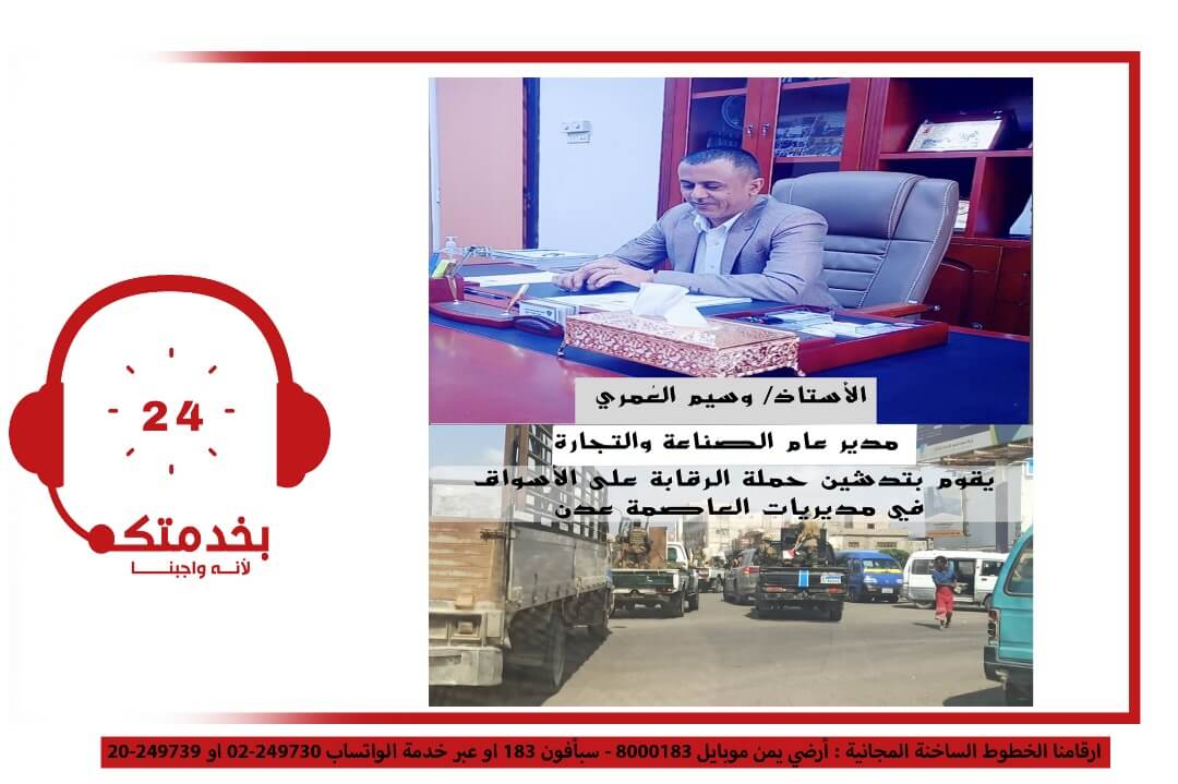 دشن مدير عام مكتب الصناعة والتجارة وسيم العُمري، حملة رقابية واسعة على الأسواق والمحلات التجارية في مديريات العاصمة عدن.