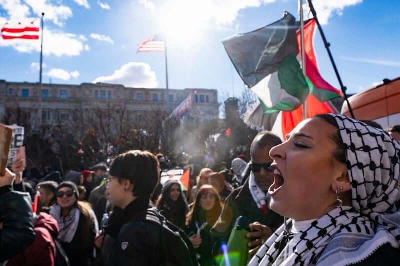 في واشنطن لوحت حشود كبيرة بالأعلام الفلسطينية، بينما تجمع المتظاهرون ومعظمهم من الشباب- ارتدى العديد منهم الكوفية- في مسيرة تضامنية في اليوم التاسع والتسعين من الحرب بين إسرائيل و”حماس” في قطاع غزة.