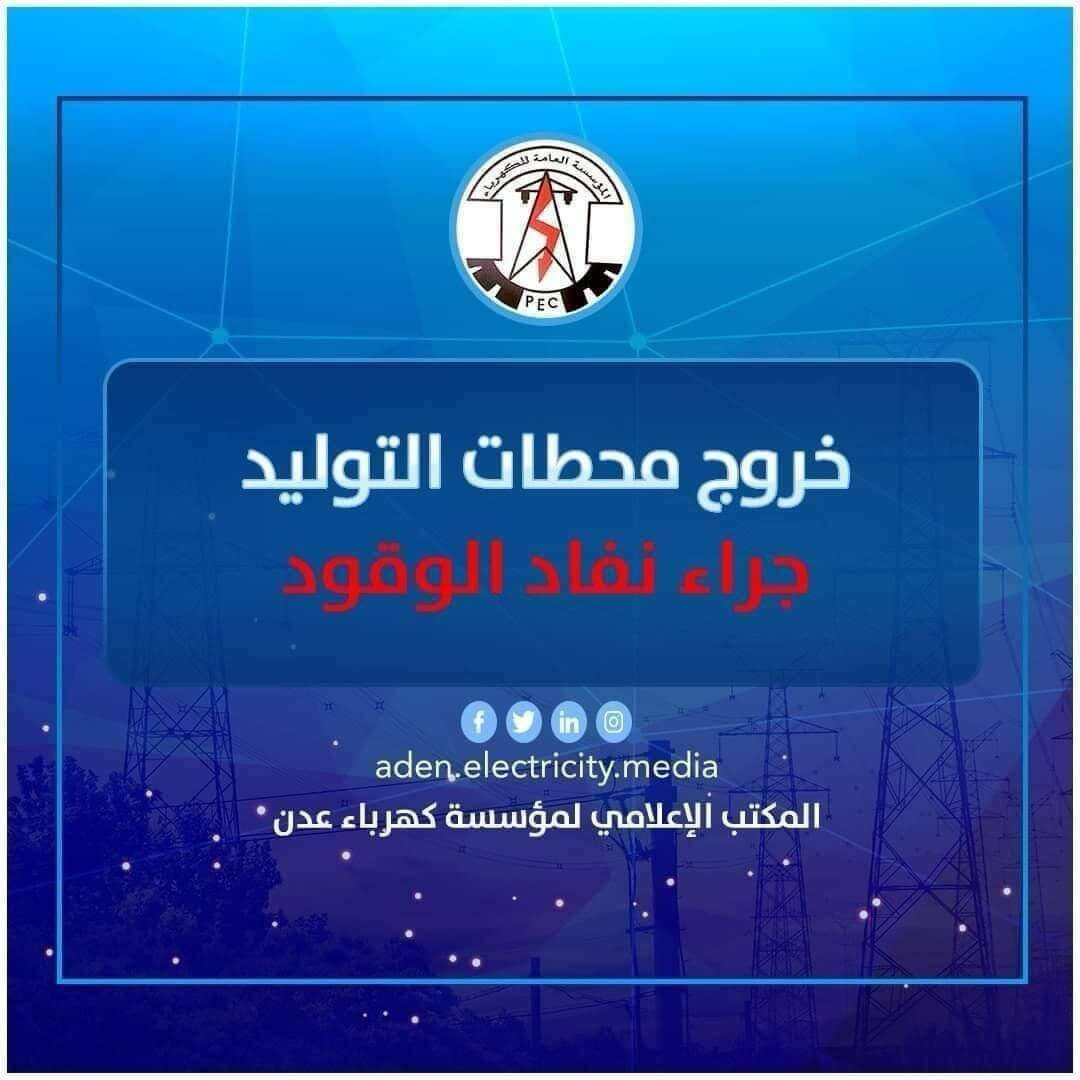 أعلنت المؤسسة العامة لكهرباء العاصمة عدن، مساء اليوم، عن خروج أكثر من 80% من توليد محطات الكهرباء جراء نفاد وقود المازوت.