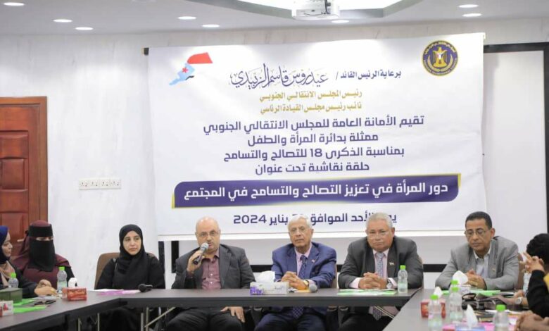 نظمت دائرة المرأة والطفل في الأمانة العامة لهيئة رئاسة المجلس الانتقالي الجنوبي، بالعاصمة عدن، حلقة نقاشية تحت عنوان “دور المرأة في تعزيز التصالح والتسامح في المجتمع”.