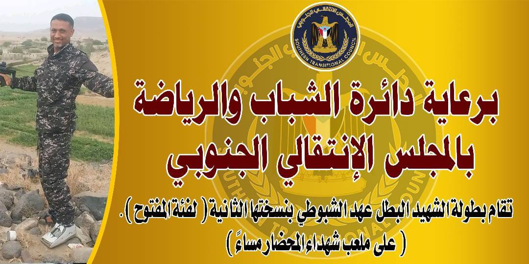 يستعد أبناء حي عمر المختار بمديرية الشيخ عثمان في العاصمة عدن، ومجموعة من أعضاء اللجنة ومحبي الشهيد القائد عهد الشبوطي لتجهيز بطولة كروية على مستوى العاصمة عدن لأحياء ذكرى الشهيد القائد عهد الشبوطي بنسختها الثانية، برعاية دائرة الشباب والرياضة بالمجلس الانتقالي الجنوبي.