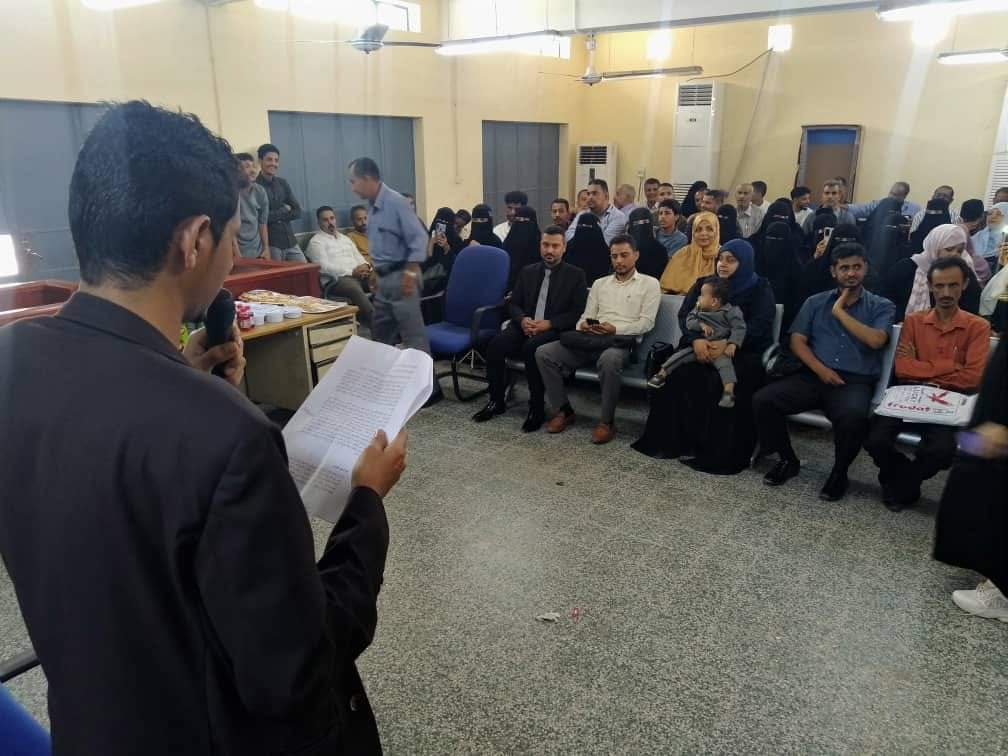 حيث بدء الحفل بتلاوة عطرة من القرآن الكريم من الموظف إبراهيم ماهر عازي، وبعدها القى فضيلة القاضي سمير الباجلي من خريجي المعهد العالي للقضاء عدن كلمة نيابة عن زملائة خرجي الدفعة الذين ساعدوا المحكمة في العمل خلال فترة العام السابق.