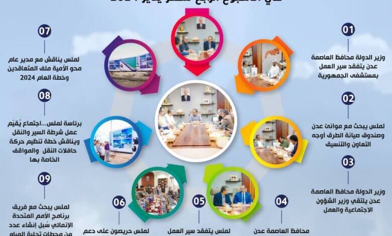 اختتم وزير الدولة محافظ العاصمة عدن الأسبوع الرابع من شهر يناير بسلسلة من الأنشطة والفعاليات التي تعددت بين نزولات ميدانية للإطلاع على سير العمل في المرافق الحكومية والمشاريع الجاري تنفيذها إضافة إلى عقد اجتماعات مع مسؤولين في الحكومة والمكاتب التنفيذية للسلطة المحلية وهيئات ومنظمات محلية وإقليمية ودولية وذلك استمرارا لتدشين محافظ عدن برنامج السلطة المحلية للعام الجديد 2024م.