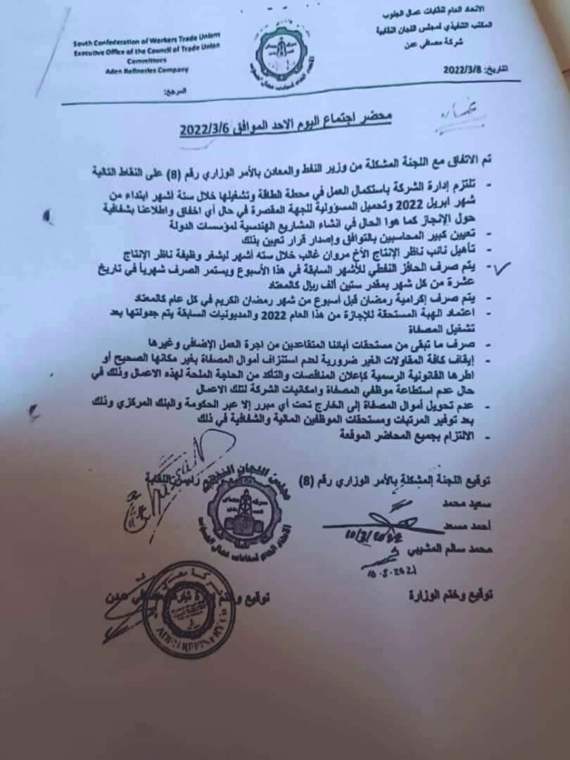 ووفقاً للمعلومات فقد عقد اجتماع هام بداية شهر مارس عام 2022 في مبنى رئاسة الوزراء بمعاشيق بحضور د. معين عبدالملك رئيس الوزراء وسعيد محمد الشماسي وزير النفط ،وأحمد المعبقي محافظ البنك المركزي ، وممثلين عن إدارة المصافي وعن نقابة عمال المصافي، وحضور نائب رئيس اللجنة التحضيرية للإتحاد الجنوبي لمكافحة الفساد معين المقرحي ، وتم الإتفاق على استكمال العمل في مشروع كهرباء المصفاة حيث إلتزمت الإدارة بتشغيل المصفاة خلال 6 أشهر إذا قامت الحكومة بدفع المبلغ المتبقي للشركة الصينية والمقدر ب7 مليون دولار.