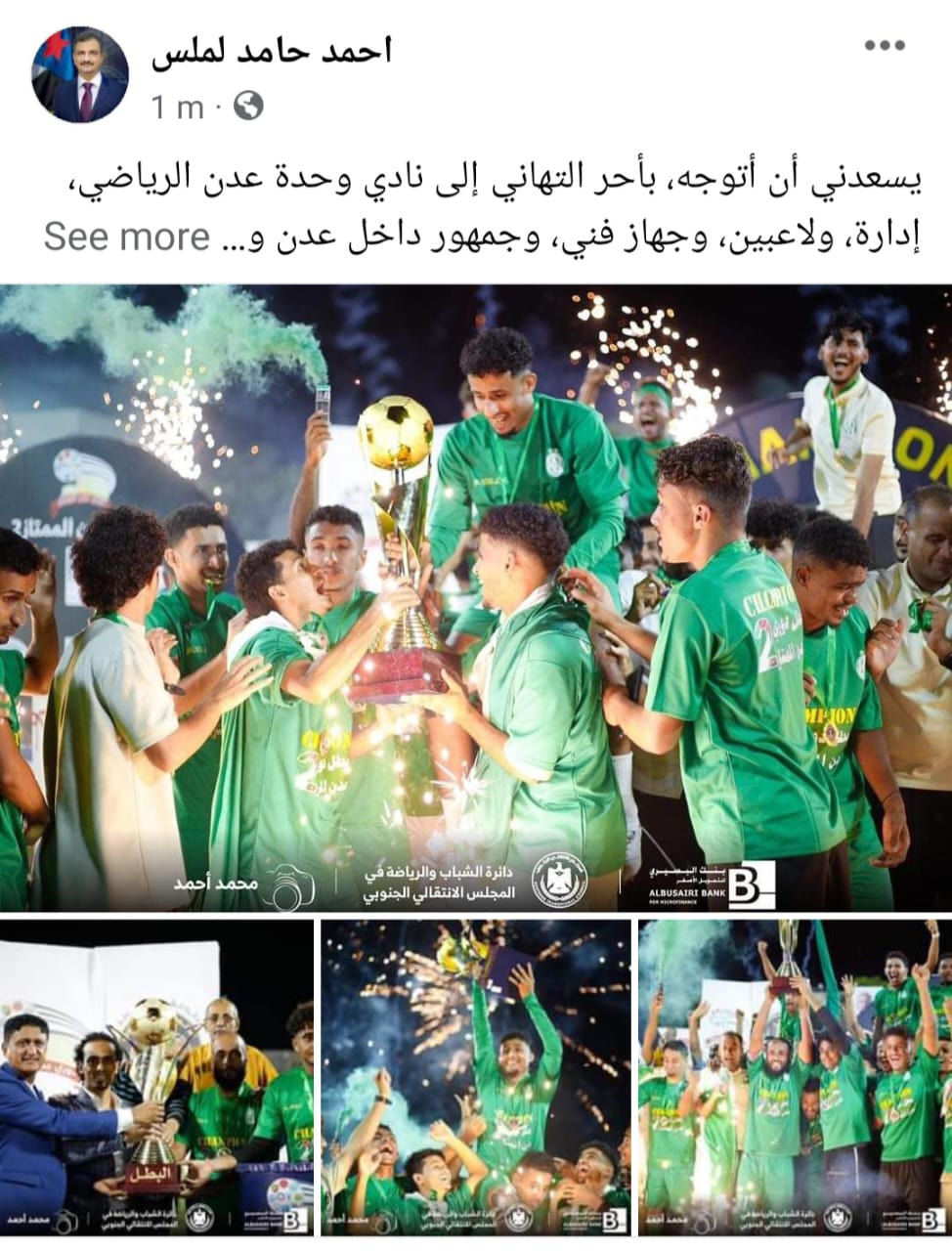 كما توّجه لملس في التهنئة التي نشرها على حساباته بمواقع التواصل الاجتماعي، بالتحية لجميع منتسبي أندية العاصمة عدن، لما أظهروه من روح تنافسية عالية خلال مشوار البطولة، ولفرع اتحاد كرة القدم ولجانه المتخصصة، ومكتب الشباب والرياضة، ورجال الأمن الأشاوس، والإعلام رياضي، ودائرة الشباب والرياضة في الأمانة العامة للمجلس الانتقالي، وراعي البطولة بنك البسيري للتمويل الأصغر الإسلامي، وللجماهير الرياضية العريضة، مؤكدا بأنها كانت كلمة السر في نجاح البطولة في نسختها الثانية.