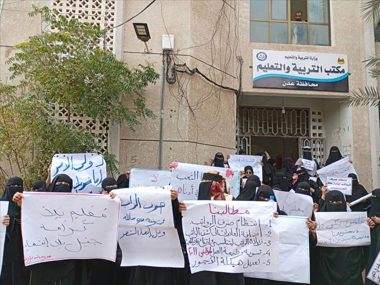معلمو العاصمة عدن يحتجون أمام مكتب التربية ويؤكدون استمرار الإضراب