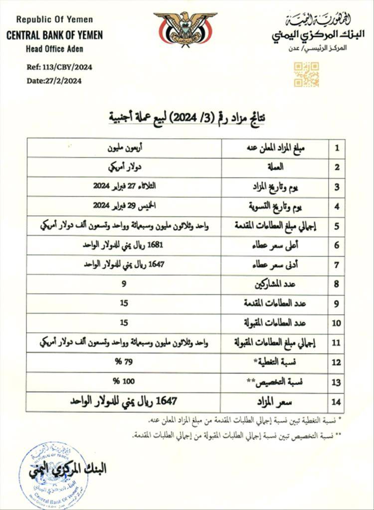 أعلن البنك المركزي اليمني اليوم الثلاثاء الموافق 27 فبراير 2024م، عن نتائج المزاد رقم (3-2024) لبيع عملة أجنبية، والتي أعلن عنها يوم الأربعاء الماضي.
