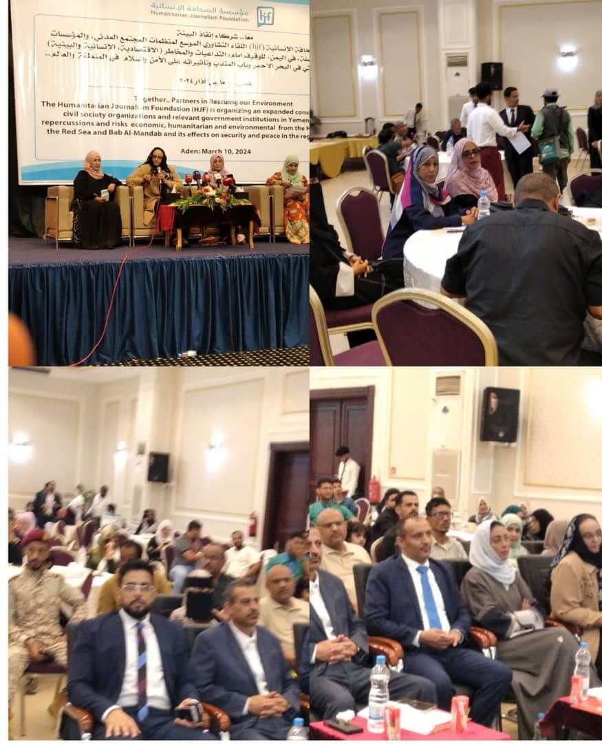 عقد صباح اليوم في العاصمه عدن اللقاء التشاوري الموسع لمنظمات المجتمع المدني والمؤسسات الحكومية ذات الصلة وبتنظيم مؤسسة الصحافة الإنسانية (hjf) اللقاء التشاوري الموسع للوقوف بشأن التداعيات والمخاطر الاقتصادية الإنسانية والبيئية جراء التصعيد الحوثي في البحر الأحمر وباب المندب وتأثيراته على الأمن والسلام في المنطقة.