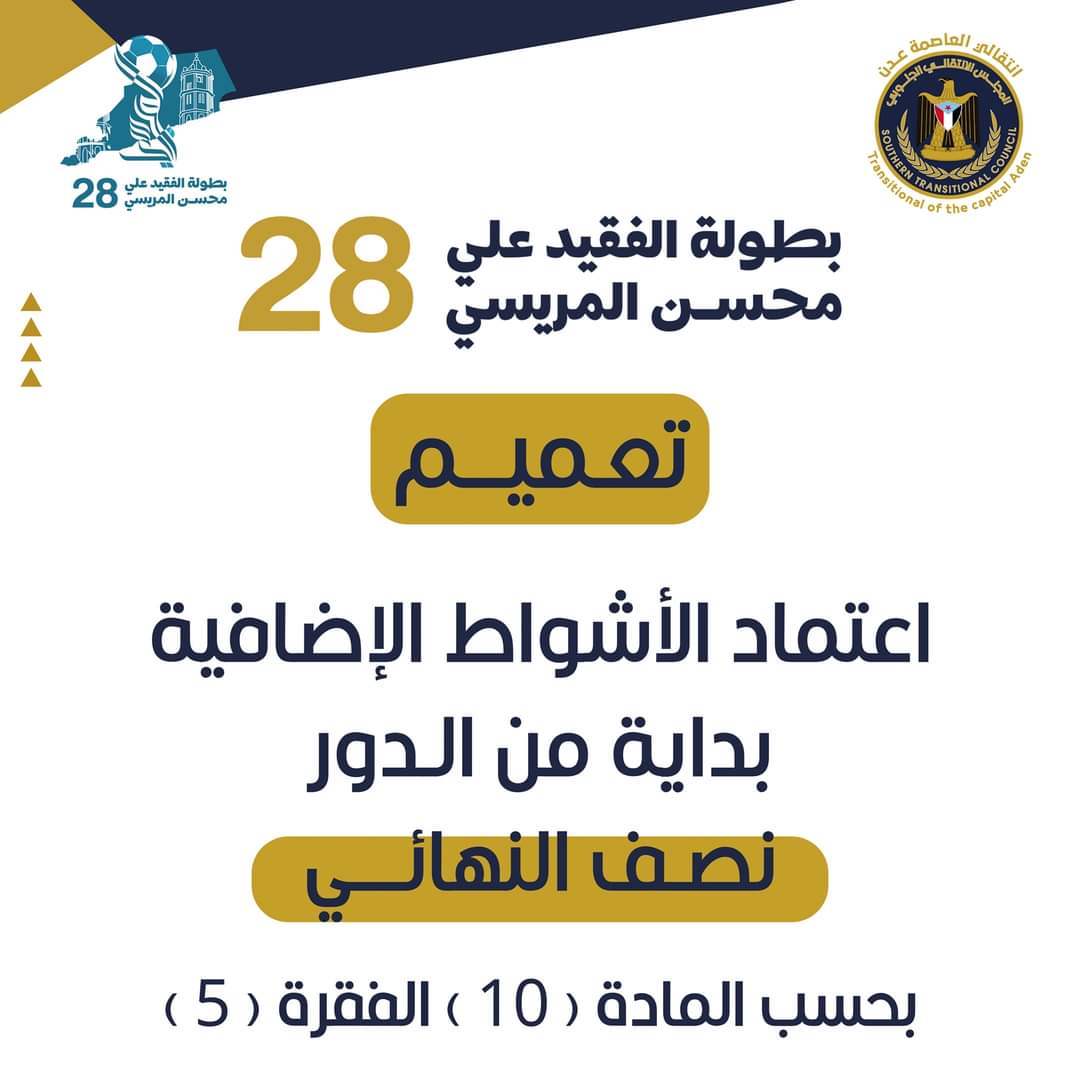 أعلنت لجنة المسابقات في اتحاد كرة القدم في العاصمة عدن عن اعتماد الأشواط الإضافية في بطولة كأس المريسي الرمضانية بنسختها الـ28 بدء من دور النصف النهائي، وذلك في حال تعادل الفريقين في الوقت الأصلي للمباراة