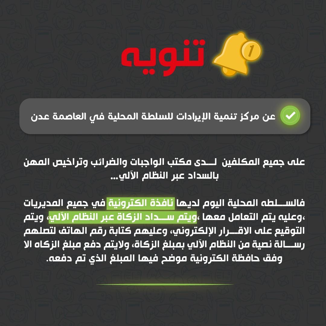 ونوه مركز تنمية الإيرادات في العاصمة عدن على كافة المكلفين لدى مكتب الواجبات والضرائب وتراخيص المهن بالسداد عبر النظام الآلي..