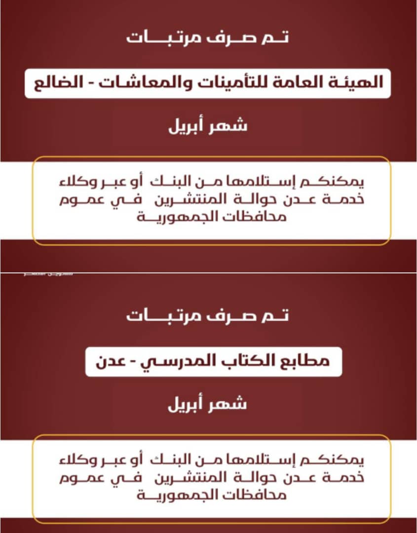 مؤكدا على كافة الموظفين لتلك الفئات استلام المرتبات من البنك أوعبر وكلاء خدمة عدن حوالة المنتشرين في عموم محافظات الجمهورية.