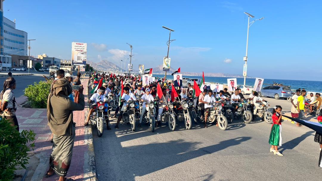 وجابت أكثر من مائة وخمسين دراجة نارية، شوارع مدينة المكلا الساحلية، رافعين أعلام الجنوب، ودولة الإمارات العربية المتحدة.