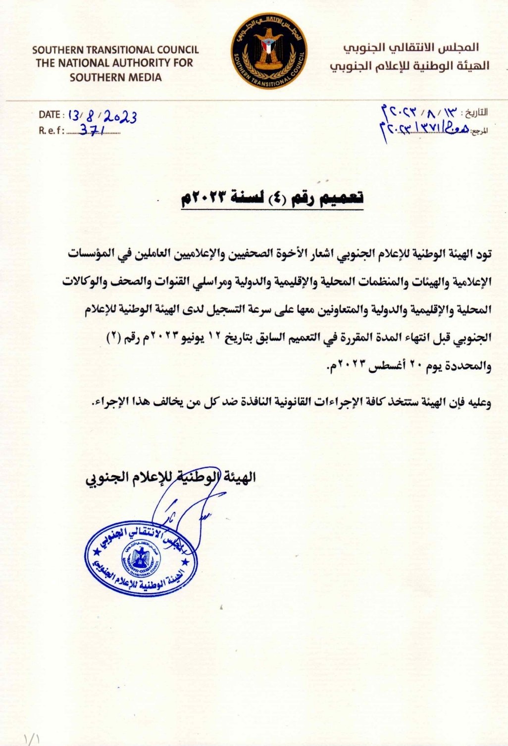 اصدرت الهيئة الوطنية للإعلام الجنوبي اليوم الأحد التعميم رقم (4) لسنة 2023م بشأن سرعة التسجيل لدى الهيئة قبل انقضاء الفترة المحددة بتاريخ 20 أغسطس 2023م.