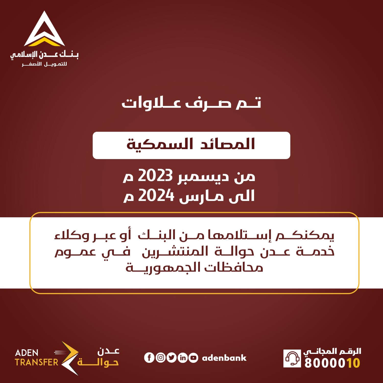 أعلن بنك عدن الإسلامي للتمويل الأصغر، اليوم الخميس، بدء عملية صرف علاوات المصائد السمكية – من ديسمبر 2023م الى مارس 2024م.
