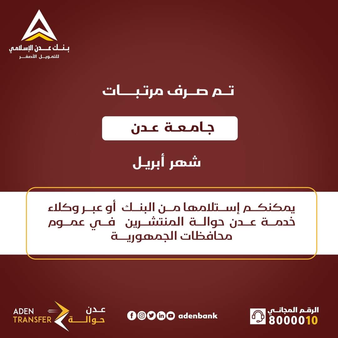 أعلن بنك عدن الإسلامي للتمويل الأصغر، اليوم الأحد 12 مايو 2024م ، عن بدء عملية صرف مرتبات شهر أبريل، لموظفي جامعة عدن