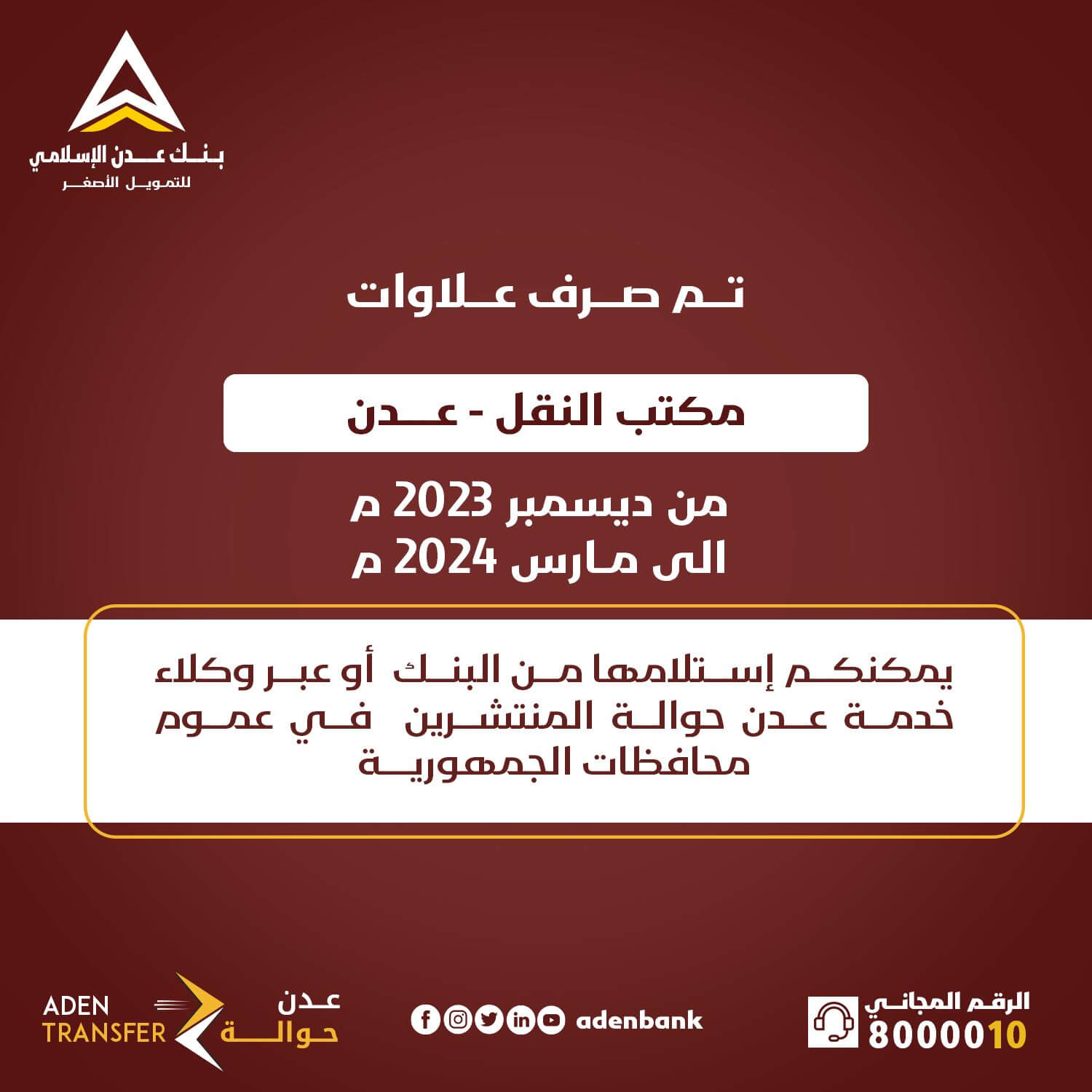 وأشار بنك عدن الاسلامي إلى أنه يمكن استلام علاوات ومرتبات مكتب النقل بالعاصمة عدن، عبر فرع البنك الرئيسي أو عبر وكلاء خدمة عدن حوالة المنتشرين في عموم المحافظات.