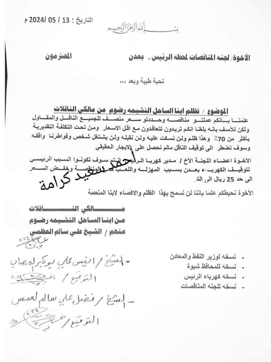 توعد عدد من مالكي الناقلات من أبناء الساحل النشيمة رضوم بقطع تموين النفط الى محطة الرئيس بالعاصمة عدن.
