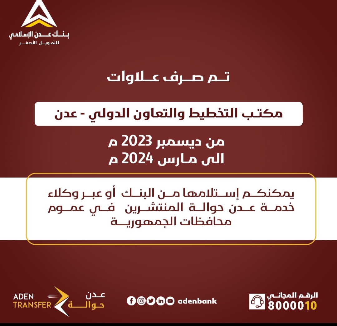 وأشار البنك أنه يمكن استلام العلاوات عبر المركز الرئيسي للبنك في في العاصمة عدن، أو عبر وكلاء خدمة (عدن حوالة) المنتشرين في عموم المحافظات.