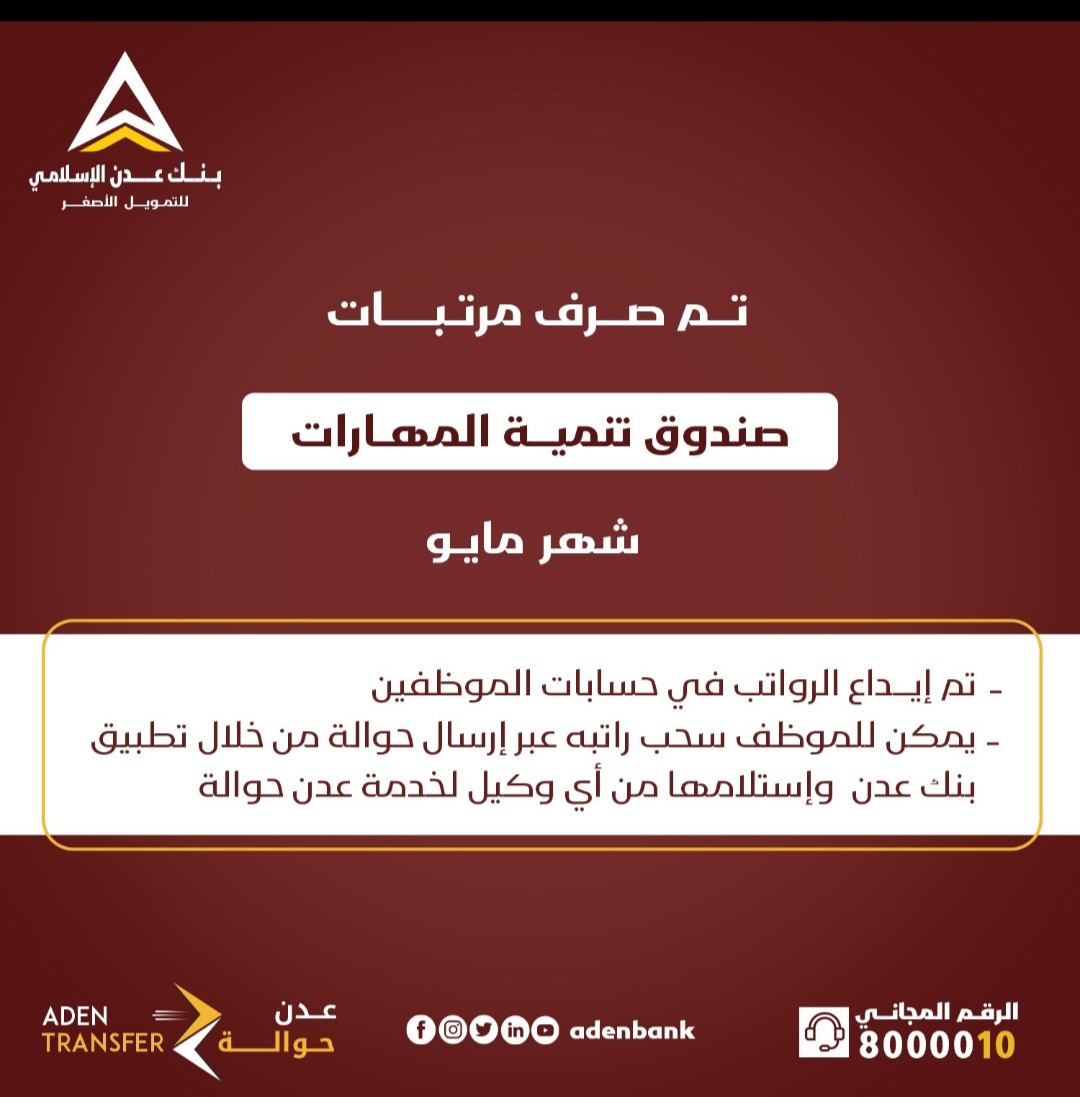 أعلن بنك عدن الإسلامي للتمويل الأصغر، اليوم الثلاثاء، بدء عملية صرف مرتبات , موظفي صندوق تنمية المهارات لشهر مايو 2024م