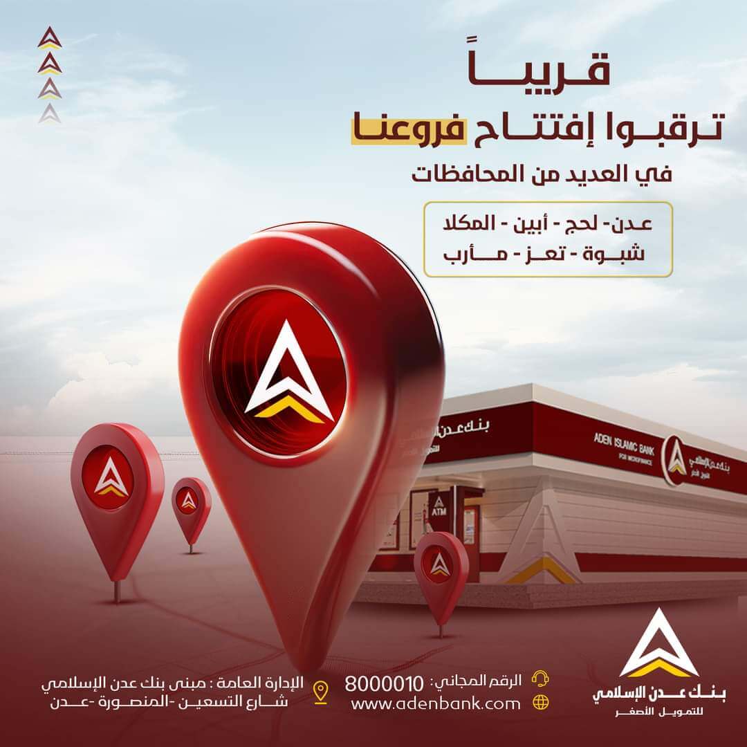 أعلن “ بنك عدن الاسلامي للتمويل الأصغر عبر حائط صفحته على الفيس بوك عن استعداده وعزمة على افتتاح فروعاً جديدة على امتداد مختلف المديريات والمحافظات ومنها عدن – لحج – أبين – المكلا – تعز مأرب – شبوة.