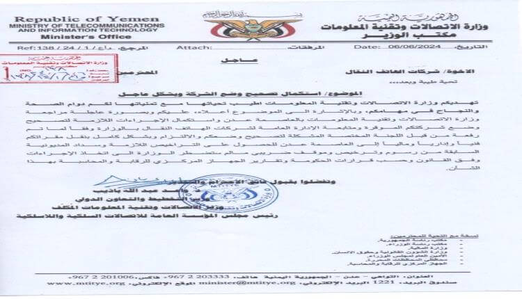 وجه وزير التخطيط والتعاون الدولي، وزير الاتصالات وتقنية المعلومات المكلف د. واعد باذيب في خطاب رسمي شركات الهاتف النقال بصورة عاجلة مراجعة وزارة الاتصالات وتقنية المعلومات بالعاصمة عدن واستكمال الاجراءات اللازمة لتصحيح اوضاعها ومتابعة الادارة لشركات الهاتف النقال بالوزارة وفقا لما تم رفعه من اللجنة المشكلة لتصحيح اوضاع الهاتف النقال والالتزام بشكل كامل بنقل مقراتها فنيا واداريا وماليا الى العاصمة عدن للحصول على التراخيص اللازمة وتسديد المديونية السابقة.