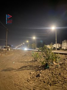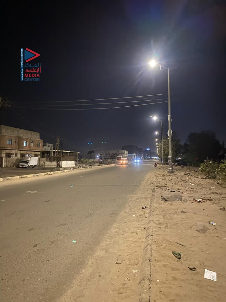 صور تبين لحظة بدء تشغيل الإنارة في خط الهناجر بمديرية خور مكسر، بكشافات LED عبر الطاقة الشمسية لضمان استمرار إنارة الطريق طوال الفترة المسائية، ومازال العمل مستمر حتى استكمال نصب أعمدة الإنارة وتشغيل الإنارة إلى مفرق سوق القات الجديد.
