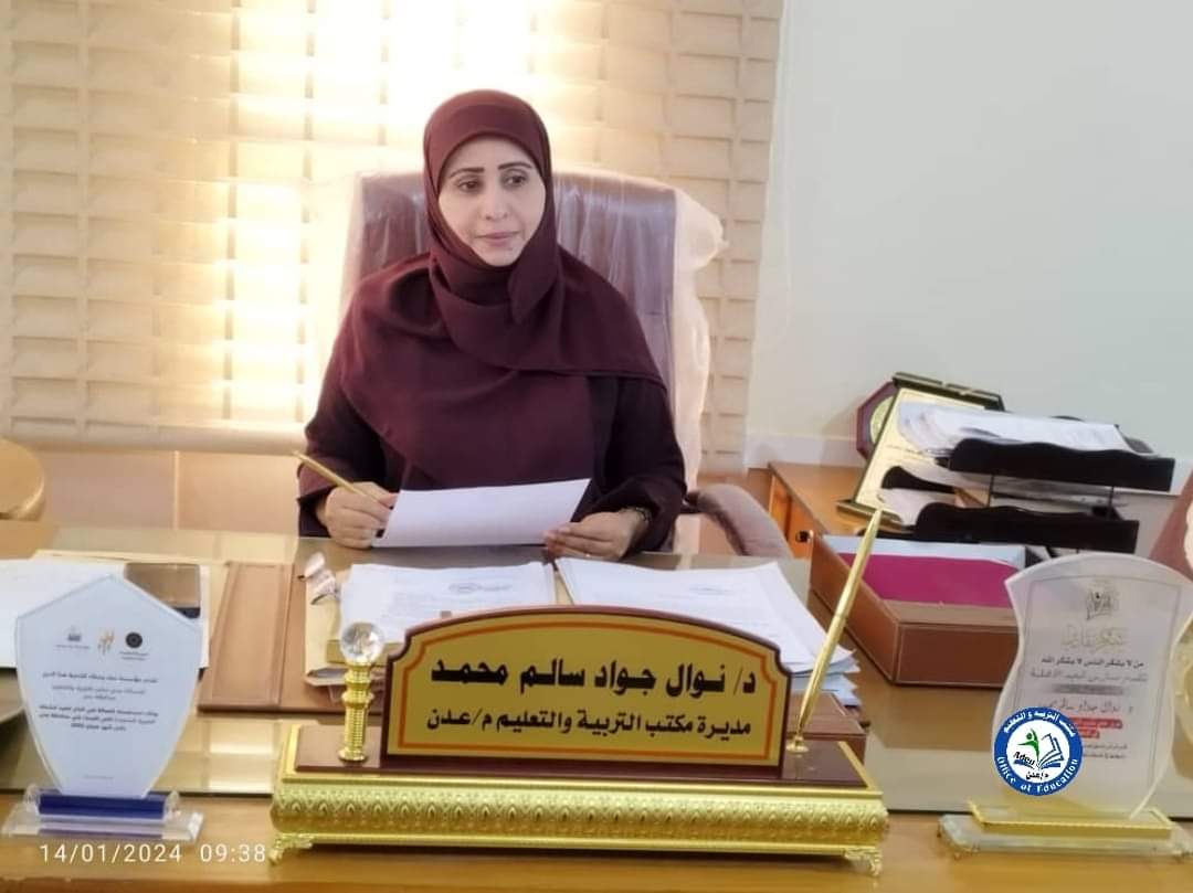 أكد مدير مكتب التربية والتعليم بالعاصمة عدن، د. نوال جواد، على ان تفاصيل المشهد العام التي يجمع كل أطراف المنظومة التعليمية والتربوية بالعاصمة، يقدم هوية عمل يمر من بوابة حريصة، تمتلك الحس والثقافة لما هو مقبل في نطاق واعي يتحمل فيه الكل، دور ذات صلة ومحتوى يذهب الى غاية وهدف مرسوم”.