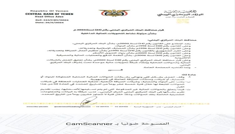 أصدر محافظ البنك المركزي اليمني في العاصمة عدن، اليوم الأربعاء الموافق 26 يونيو 2024، قراراً بشأن مزاولة نشاط التحويلات المالية الداخلية.