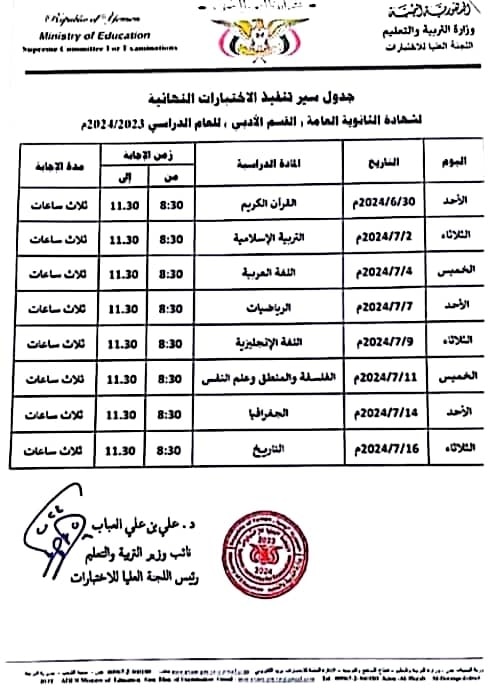 وينشر (مكتب إعلام العاصمة عدن)، جدول لسير تنفيذ الاختبارات النهائية لشهادة الثانوية العامة (القسم الأدبي) للعام الدراسي 2023/2024م.