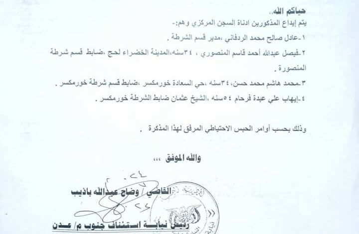 وجه نشطاء جنوبيون تاييد هم لقراراحتجاز اربعة من افراد الامن بينهم مدير قسم شرطة خورمكسر ، وايداعهم السجن المركزي بعدن ، نتيجة انتهاكهم الحصانة القضائية( الاعتداء على وكيل نيابة).