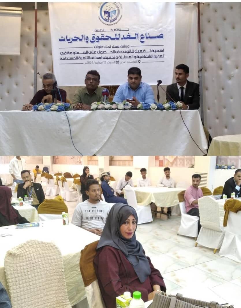 نظمت منظمة صناع الغد للحقوق والحريات اليوم السبت بقاعة قصر العرب في العاصمة عدن، ورشة عمل عن قانون حق الحصول على المعلومات، بمشاركة عدد من الجهات منها (وزارة العدل، ووزارة الشؤون القانونية وحقوق الإنسان، ومكتب النائب العام، ومكتب إعلام العاصمة عدن، والهيئة العليا لمكافحة الفساد، والمؤسسات الإعلامية والنشطاء، ومنظمة المجتمع المحلي، والهيئة الوطنية للإعلام الجنوبي).
