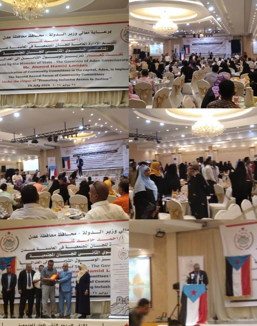 برعاية معالي وزير الدولة محافظ العاصمه عدن الاستاذ/ أحمد حامد لملس دشنت اللجان المجتمعية بعدن صباح اليوم الخميس الموافق 25 يوليو 2024م الملتقى السنوي الثاني للجان المجتمعية تحت شعار تعزيز الوصول الشامل للعدالة.