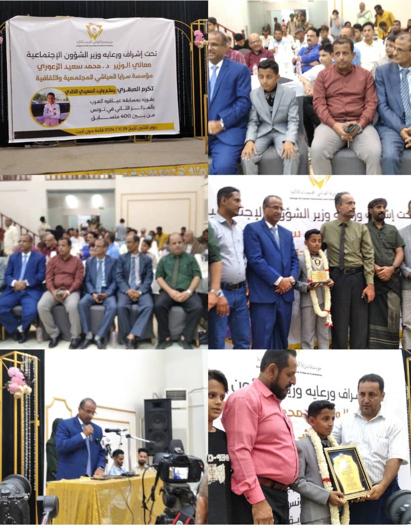 كرمت مؤسسة سرايا العياشي المجتمعية الثقافية، اليوم الاثنين في العاصمة عدن، النابغة الشابة يسلم وليد السعيدي الكلدي، الحاصل على المركز الثاني في مسابقة الحساب الذهني والرياضيات في جمهورية تونس الشقيقة.