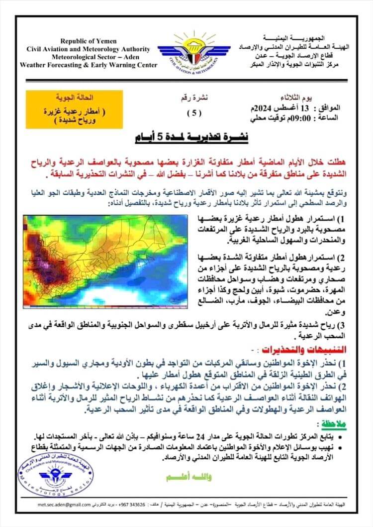 بحسب بلاغ عمليات العاصمة عدن، بناءً على تحذيرات ونشرات الأرصاد الجوية، التي تشير إلى احتمالية هطول أمطار رعدية مصحوبة برياح شديدة وذلك خلال الـ72 ساعة القادمة.