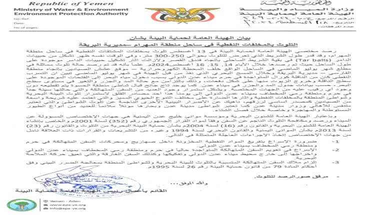 أصدرت هيئة حماية البيئة اليوم بيان توضيحيا حول التلوث الناجم عن المخلفات النفطية في ساحل منطقة المهرام –مديرية البريقة، هذا ورصد مختصي الهيئة العامة لحماية البيئة في 13 أغسطس تلوث بمخلفات المشتقات النفطية في ساحل منطقة المهرام، وقد قدر طول الشريط الذي تعرض للتلوث بحوالي 250-300 متر.
