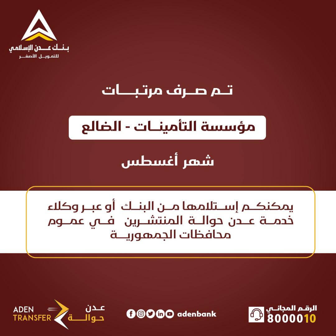 أعلن بنك عدن الإسلامي للتمويل الأصغر، اليوم الثلاثاء ، عن بدء عملية صرف مرتبات مؤسسة التأمينات فرع محافظة الضالع لشهر أغسطس 2024م