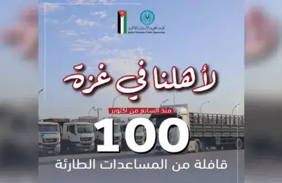 أعلنت الهيئة الخيرية الأردنية الهاشمية، اليوم الأحد، عن بلوغ عدد القوافل الأردنية التي وصلت إلى قطاع غزة منذ بدء انطلاق القوافل البرية إلى 100 قافلة.