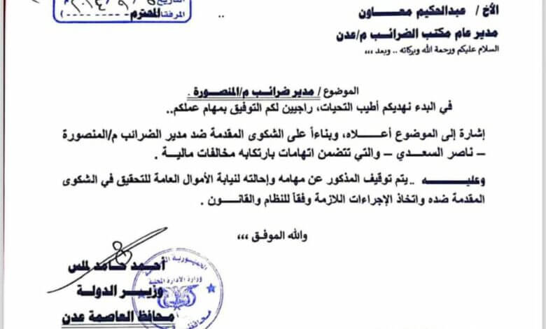 أصدر محافظ العاصمة عدن، الأستاذ أحمد حامد لملس، قراراً بتوقيف مدير ضرائب مديرية المنصورة، ناصر السعدي، عن مهامه.