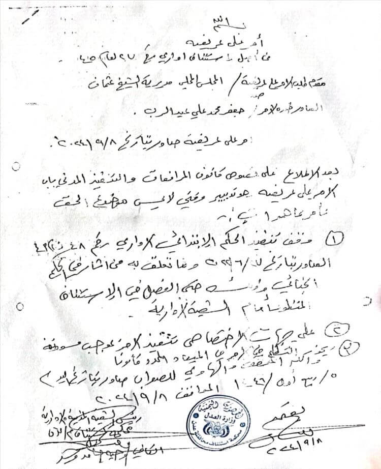 وأوضحت وثيقة الشعبة المدنية والإدارية بمحكمة استئناف عدن أن الاستئناف الإداري رقم 27 للعام 1445هجرية، قد تلقى طلب الأمر على عريضة مقدم من المجلس المحلي بمديرية الشيخ عثمان صادر ضد جعفر علي عبد الرب.