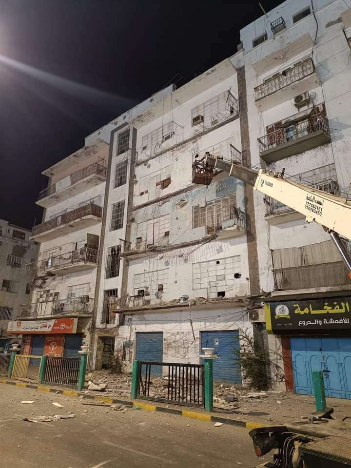 وقال الأستاذ عبدالرحيم جاوي مدير عام مديرية المعلا (بدأنا مساء أمس بأعمال إزالة البلوكانات المتهاكلة في عمارة ارتيريا بعد اتفاق مع السكان وبإشراف مهندسين من مكتب الاشغال العامة بالعاصمة عدن وتمويل كامل من السلطة المحلية في المديرية)