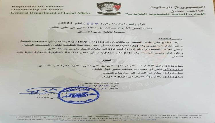أصدر أ.د. الخضر ناصر لصور، رئيس جامعة عدن قرارا بتعيين أستاذ مساعد د . ماجد علي بن علي مثنى طوئرة، عميداً  لكلية طب الأسنان جامعة عدن.