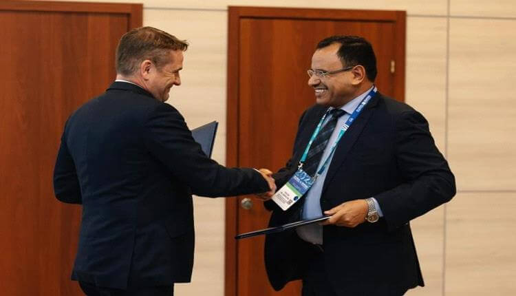جرى في مدينة، سانت بطرسبورغ، اليوم، بين، بلادنا، ودولة روسيا الاتحادية، التوقيع على مذكرة تفاهم تنائي في مجال الثروة السمكية بين البلدين، على هامش فعاليات المنتدئ الدولي لصناعة الصيد، ومعرض صناعة الصيد والمأكولات البحرية والتكنولوجيا، 19-17من شهر سبتمر 2024م، وقعها عن جانب بلادنا، وزير الزراعة والري والثروة السمكية، اللواء/ سالم السقطري، وعن الجانب الروسي، رئيس الوكالة الفيدرالية الروسية لمصائد الأسماك، السيد/ شيستاكوف إيليا فاسيليفيتش، بحضور وفد بلادنا، والمكون من، وكيل الوزارة لقطاع خدمات الأنتاج والتسويق السمكي، غازي لحمر، والرئيس التنفيدي لبنك التسليف التعاوني الزراعي، حاشد الهمداني، ورئيس مجلس إدارة مصنع المكلا لتعليب الأسماك، عمر باوزير، ومدير عام شركة التميمي للأسماك، حسين التميمي.