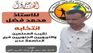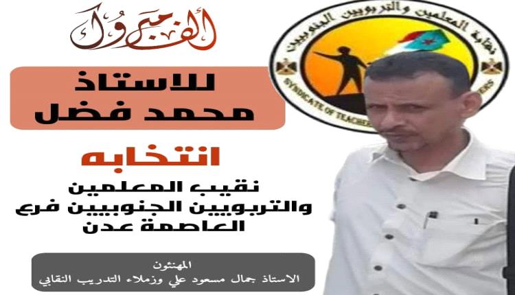 فاز في الاجتماع الانتخابي الاستاذ محمد فضل بعد أن حصد أعلى الأصوات لتقلده اللجنة الإشرافية منصب نقيب المعلمين والتربويين الجنوبيين في العاصمة عدن وفي الكشف المرفق اسماء الفائزين في الانتخاب النقابي.