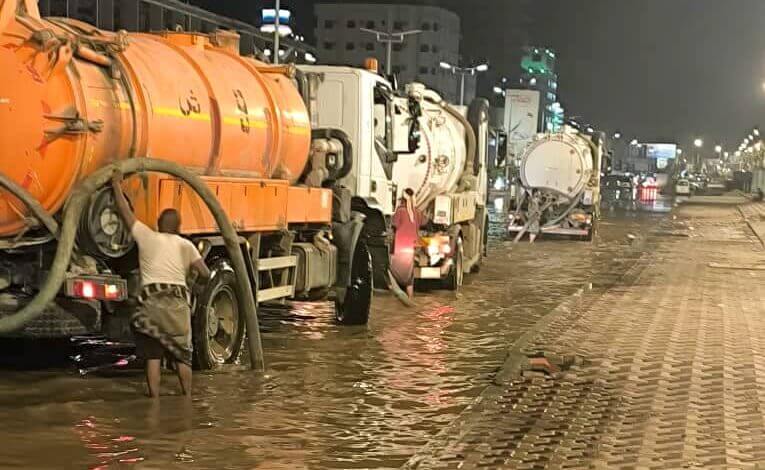 تواصل فرق الصرف الصحي بالمؤسسة المحلية للمياه والصرف الصحي بالعاصمة عدن شفط مياه الامطار التي هطلت في مديريات المنصورة والشيخ عثمان ودار سعد.
